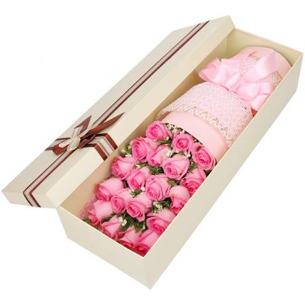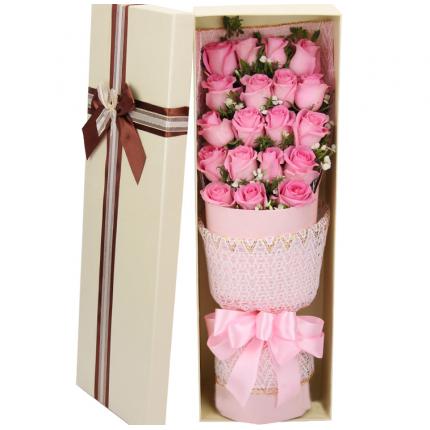 鲜花包装:W网+粉色平面纸,W网托底、粉色缎带,高档礼盒精美包装。
