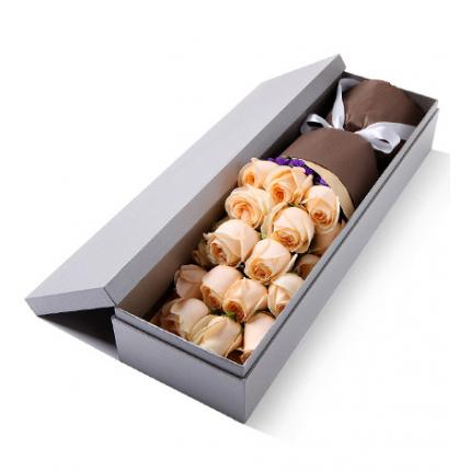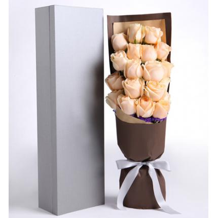 材料:19朵精品香槟玫瑰,搭配勿忘我适量。