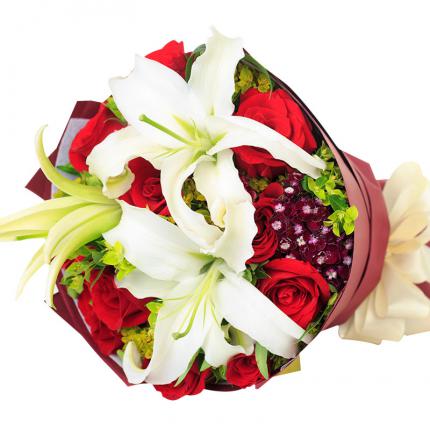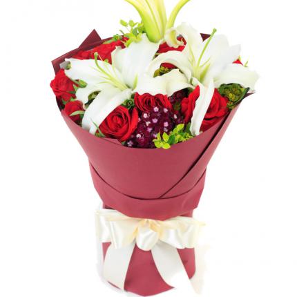 材料:11朵精品红玫瑰,3朵香水百合,搭配石竹梅、叶上金点缀。