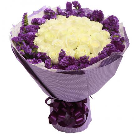 鲜花包装:精美紫色硬纸包装,紫色丝带束扎。