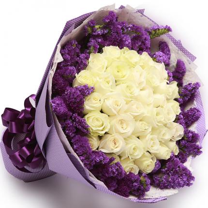 材料:33朵精品白玫瑰,外围搭配丰满勿忘我。