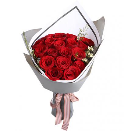 材料:19朵红玫瑰,白色腊梅2枝(如腊梅无货,则用白色石竹梅或满天星代替)