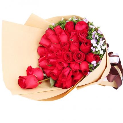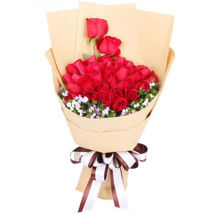 材料:33朵精品红玫瑰,搭配相思梅外围丰满点缀。