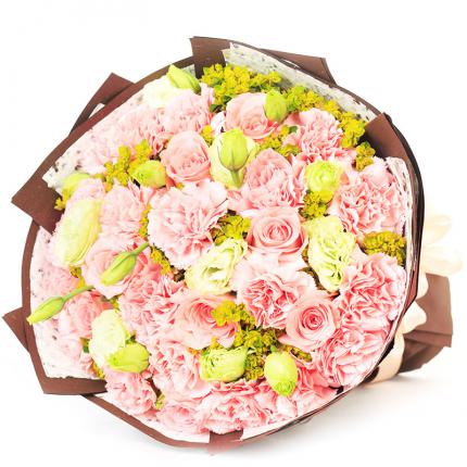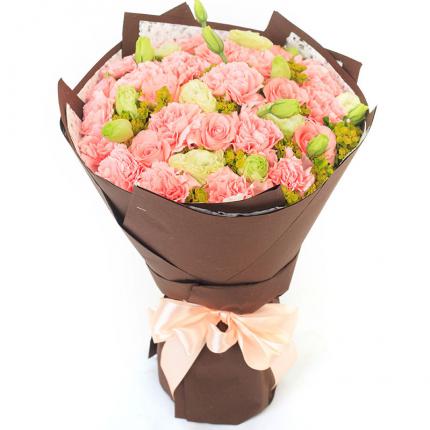材料:19朵粉色康乃馨,搭配洋桔梗穿插丰满点缀。
