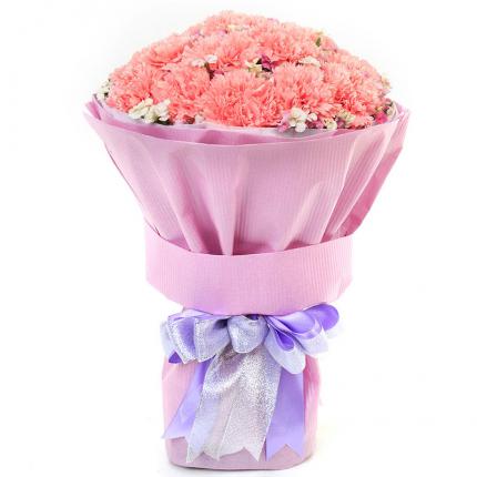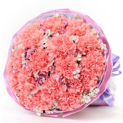 材料:19朵粉色康乃馨、搭配相思梅点缀。