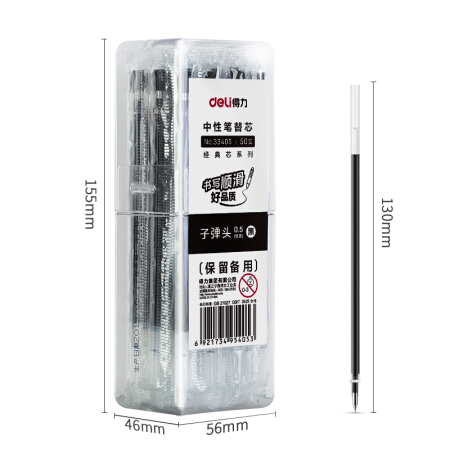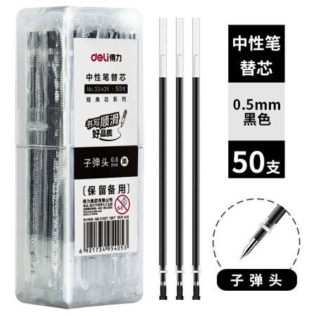 得力(deli)0.5mm黑色子弹头中性笔芯 水笔签字笔替芯 50支/桶33405
