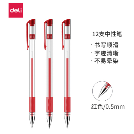得力(deli)0.5mm办公中性笔 水笔签字笔 12支/盒红色34567