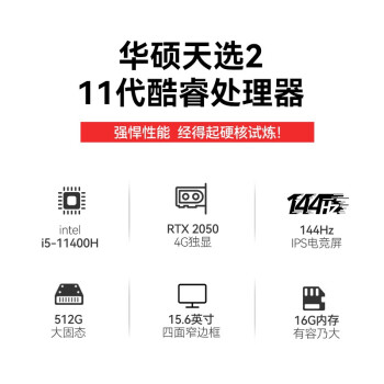 华硕笔记本电脑 天选2 15.6英寸学习设计办公电竞游戏本电脑(i5-11400H/RTX2050/16G内存/512G固态/144Hz刷新率/日蚀灰)