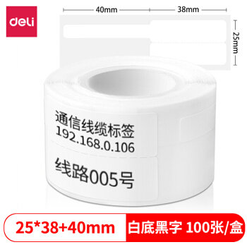 得力(deli)线缆热敏标签纸(25*38+40mm) 三防不干胶热敏打印纸 白底黑字(100张/盒)11886