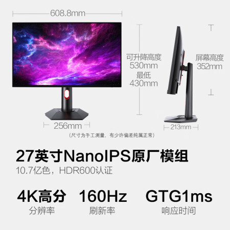 HKC 27英寸显示器 神盾MG27U Nano IPS屏 4K高清160Hz超频 10.7亿色HDR600 四边微边框旋转升降电竞屏显示器