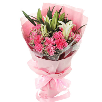 11枝粉色康乃馨+2枝白色香水百合花束 同城鲜花配送