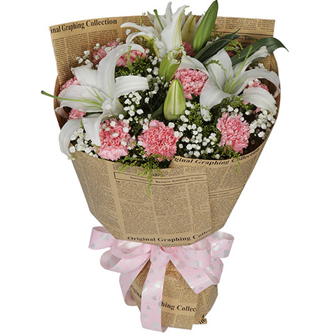 11枝粉色康乃馨+2枝多头香水百合花束 同城鲜花配送