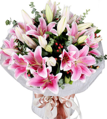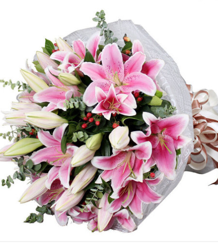 材料:9支多头粉百合,尤加利叶、火龙珠、黄莺草点缀