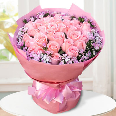 鲜花包装:粉色包装纸圆形外包,粉色蝴蝶结系扎
