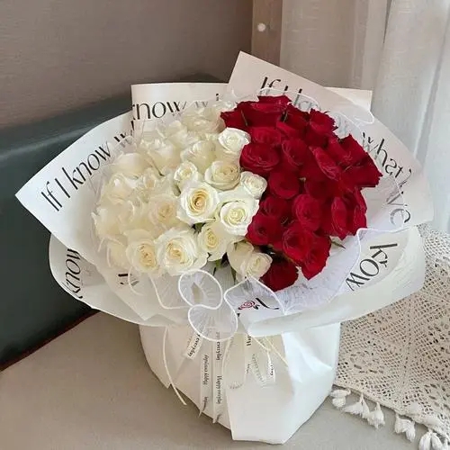 鲜花包装:白色卷边蕾丝网纱+白色英文硬质包装,白色英文缎带+白色橡皮筋束扎