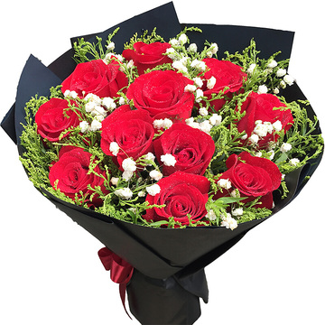 材料:11朵红玫瑰,黄莺丰满间插,白色满天星点缀