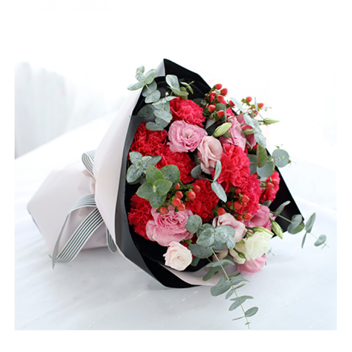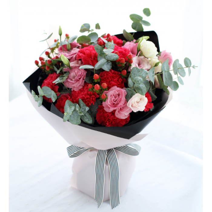 材料:11朵红色康乃馨,4朵粉色桔梗,5朵红豆,尤加利适量(如当地红豆缺货,用相思梅等其他寓意相近配材替代。)