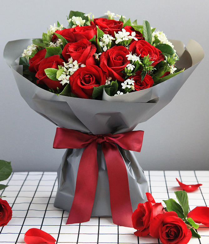 鲜花包装:深灰色opp雾面纸2张,酒红色宽缎带1.5米