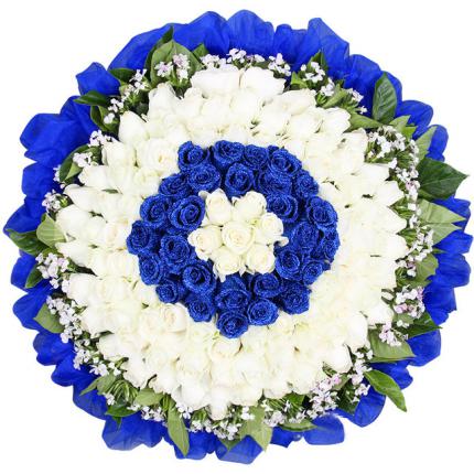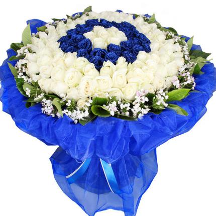 材料:69朵精品白玫瑰,30朵蓝色妖姬,搭配相思梅、栀子叶点缀。