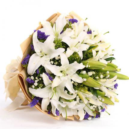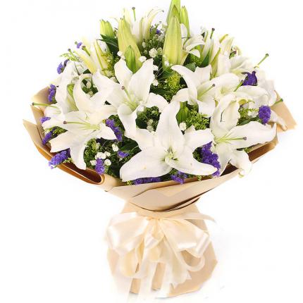 材料:8朵香水百合,搭配黄莺、满天星、勿忘我点缀。