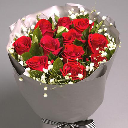 材料:11朵红玫瑰,搭配满天星、栀子叶点缀。