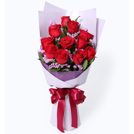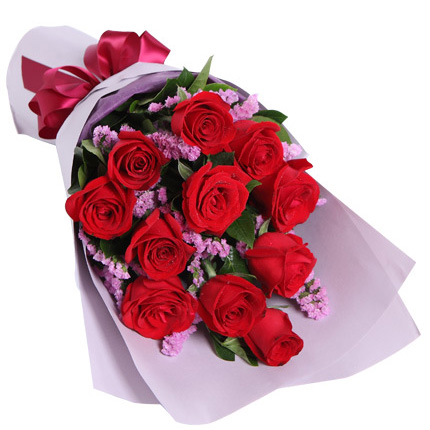 材料:11朵红玫瑰,搭粉色勿忘我、栀子叶