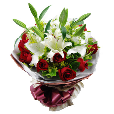材料:11朵红玫瑰,2支多头白香水百合,配花