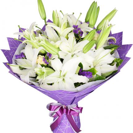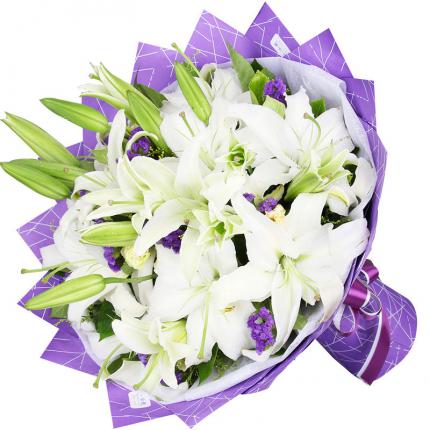 材料:8朵香水白百合,搭配黄莺、桔梗、勿忘我点缀。
