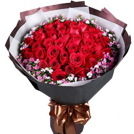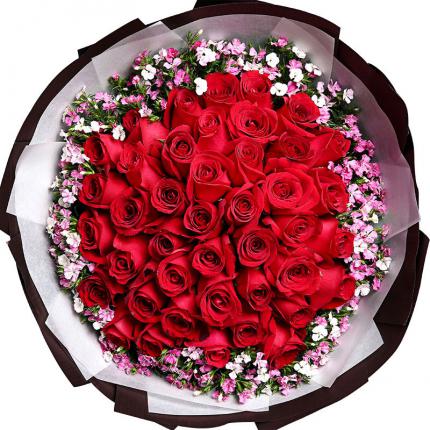材料:33朵精品红玫瑰,搭配石竹梅外围点缀。