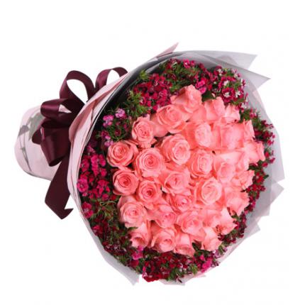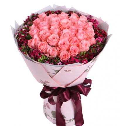 材料:33朵戴安娜粉玫瑰,搭配石竹梅围绕点缀。