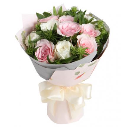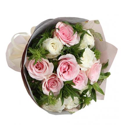 材料:6朵粉玫瑰,5朵白玫瑰,搭配适当绿叶点缀。