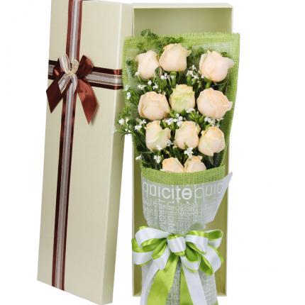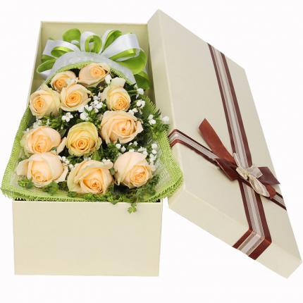 材料:11朵精品香槟玫瑰,搭配相思梅点缀。