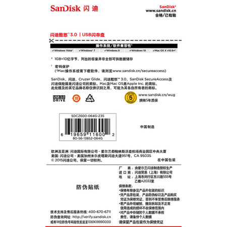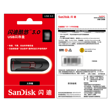 闪迪 (SanDisk) 64GB USB3.0 U盘 CZ600酷悠 黑色