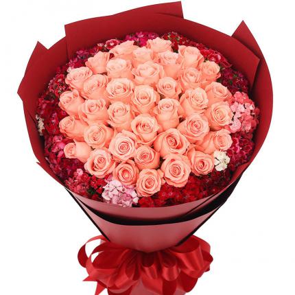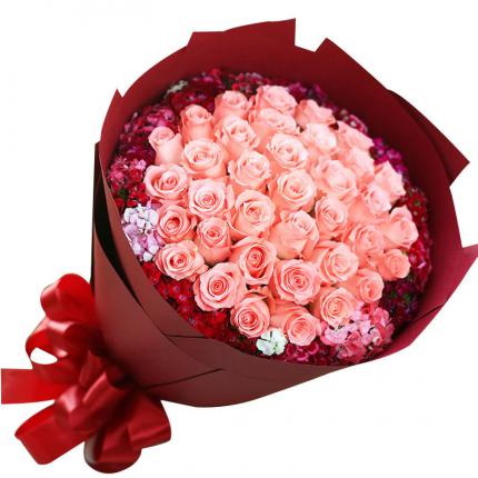 材料:33朵精品粉玫瑰,搭配红色相思梅。